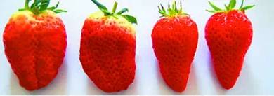 网传:左边两颗我们经常见到这样的,形状不规则,但是可能特别大,这种就是过量使用激素的草莓,果面凹凸不平,果形不整。右边两颗就是自然生长的草莓了,正常的草莓是呈圆锥形或长圆锥形。所以买草莓要买这种小圆锥型的!!